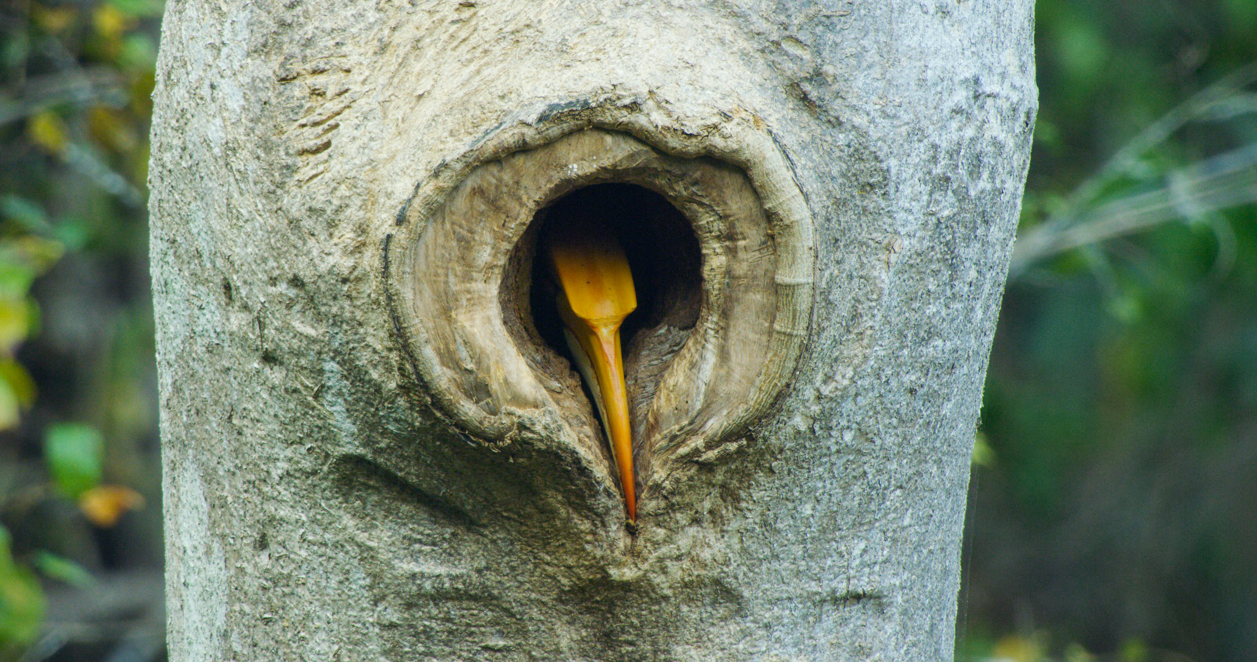 据了解,每年2月底至7月初是双角犀鸟的繁殖期。期间,为了使雌鸟和雏鸟能得到充足的食物,雄鸟必须一次又一次地外出觅食,并将食物投喂给封在巢中的雌鸟和雏鸟。