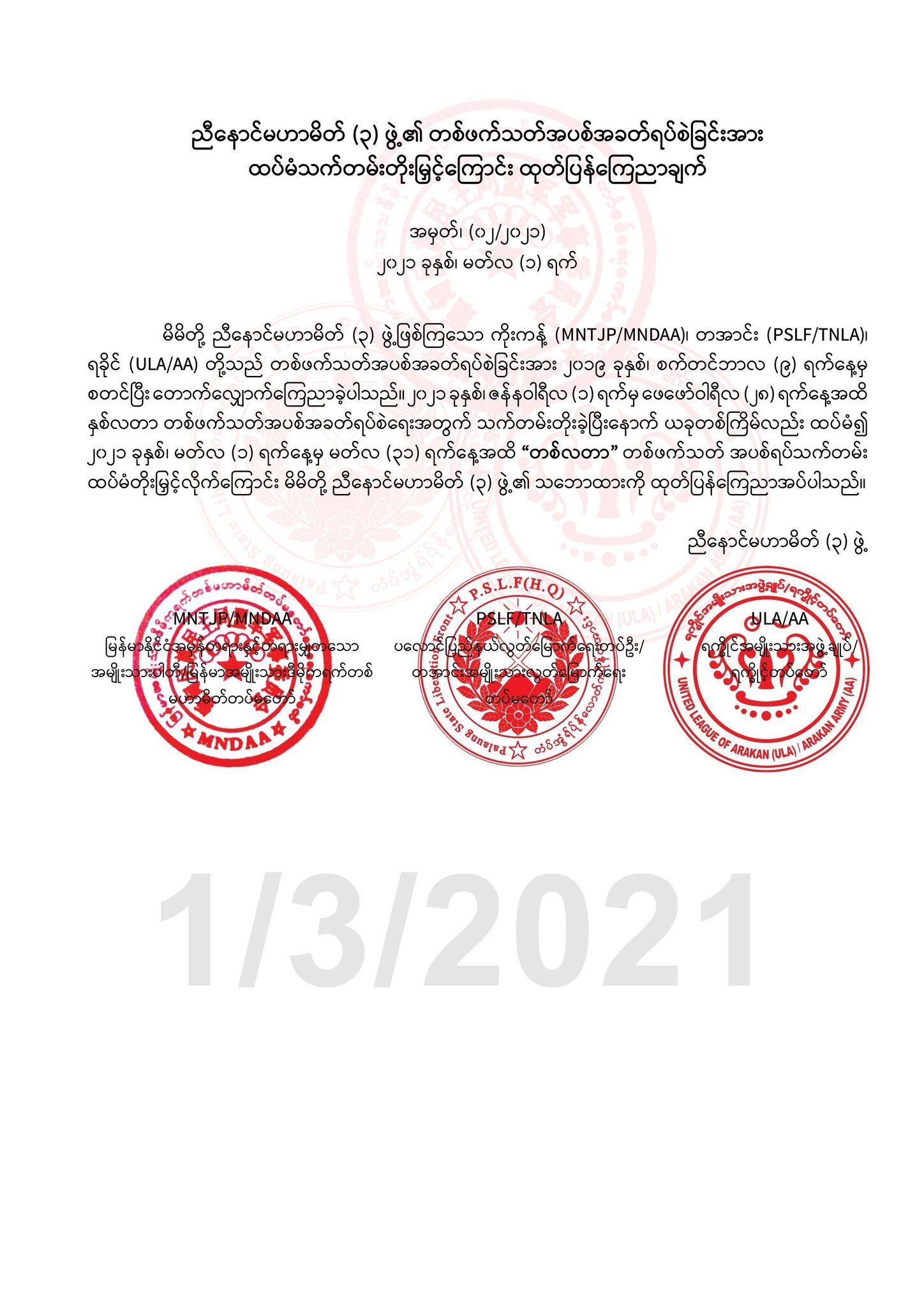 当地时间3月1日,缅甸北部的德昂民族武装、若开民族武装和果敢民族民主同盟军宣布,将停火时间延长至3月31日。(总台记者 王悦舟)