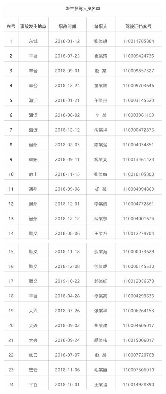 据北京市公安局公安交通管理局网站消息,近日,公安机关交通管理部门对因发生重大交通事故后逃逸构成犯罪,被依法追究刑事责任的24名驾驶人依法吊销机动车驾驶证,且终生不得重新取得机动车驾驶证。