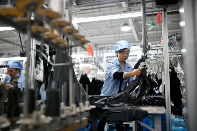 2月24日,宁夏同心县中核(宁夏)同心防护科技有限公司扶贫车间的女工在加工服装。(新华社记者王鹏摄)