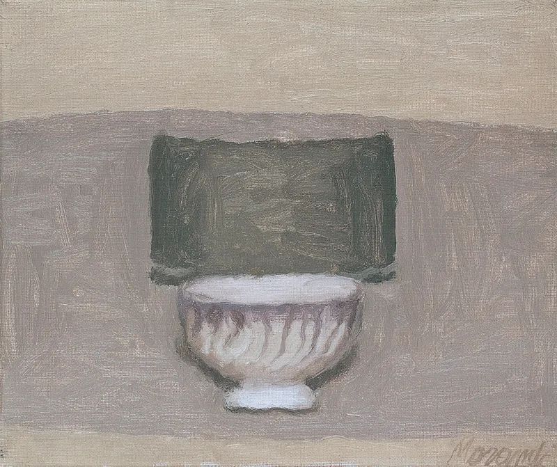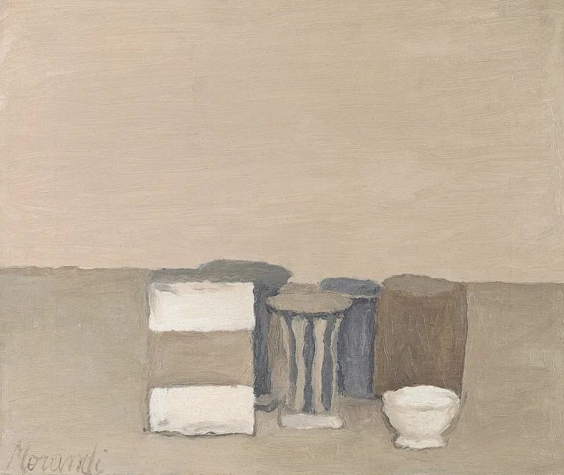 莫兰迪像我们所有人一样生活在这样的威胁里,生活在这片荒芜的风景里, 即使他远离尘事;暴力,以其最恶劣的形式,并没有放过格里扎纳这个乡下,这个他战时避难的地方。他知道身边在发生着什么,知道是什么在威胁着他以及他的亲友。只是他必定想过,或者说感到, 对这一切,唯一值得的回应便是尽可能更深地专注于作品。他比以往更警惕善辩雄才与故作姿态;他也避免借助任何一种神秘学——就像我们在与他相对比较接近的画家朱利叶斯·比希尔那里所看到的, 或者像在安东尼·塔皮埃斯的画中,神秘学以更突兀的方式出现,而他似乎是吸取了他们的教训。他一直在沉思冥想,他对着那一小堆物件,不厌其烦地挑选着,将它们聚拢了来,又分散了去,来来回回,反反复复,而没有丝毫卖弄的痕迹,静静地,近乎不动声色,如一个棋手,让赫伯特· 李斯特的镜头亦为之惊叹。