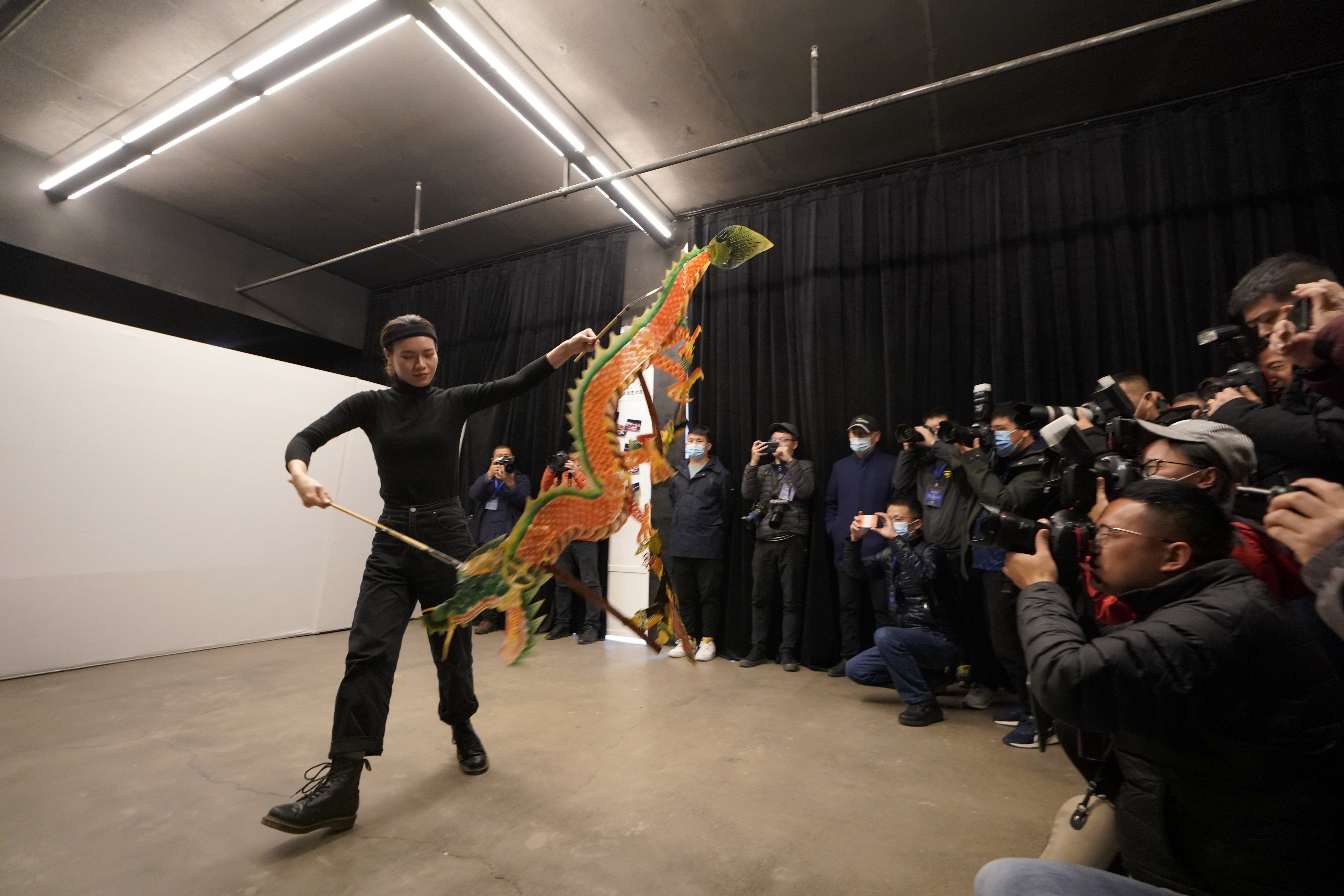 2020年11月28日,韩非子剧社的演员在北京通州台湖双益发文创园展示皮影道具。新华社记者邢广利 摄
