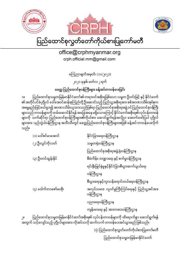 △缅甸联邦议会代表委员会(CRPH)任命四位临时部长的正式文件