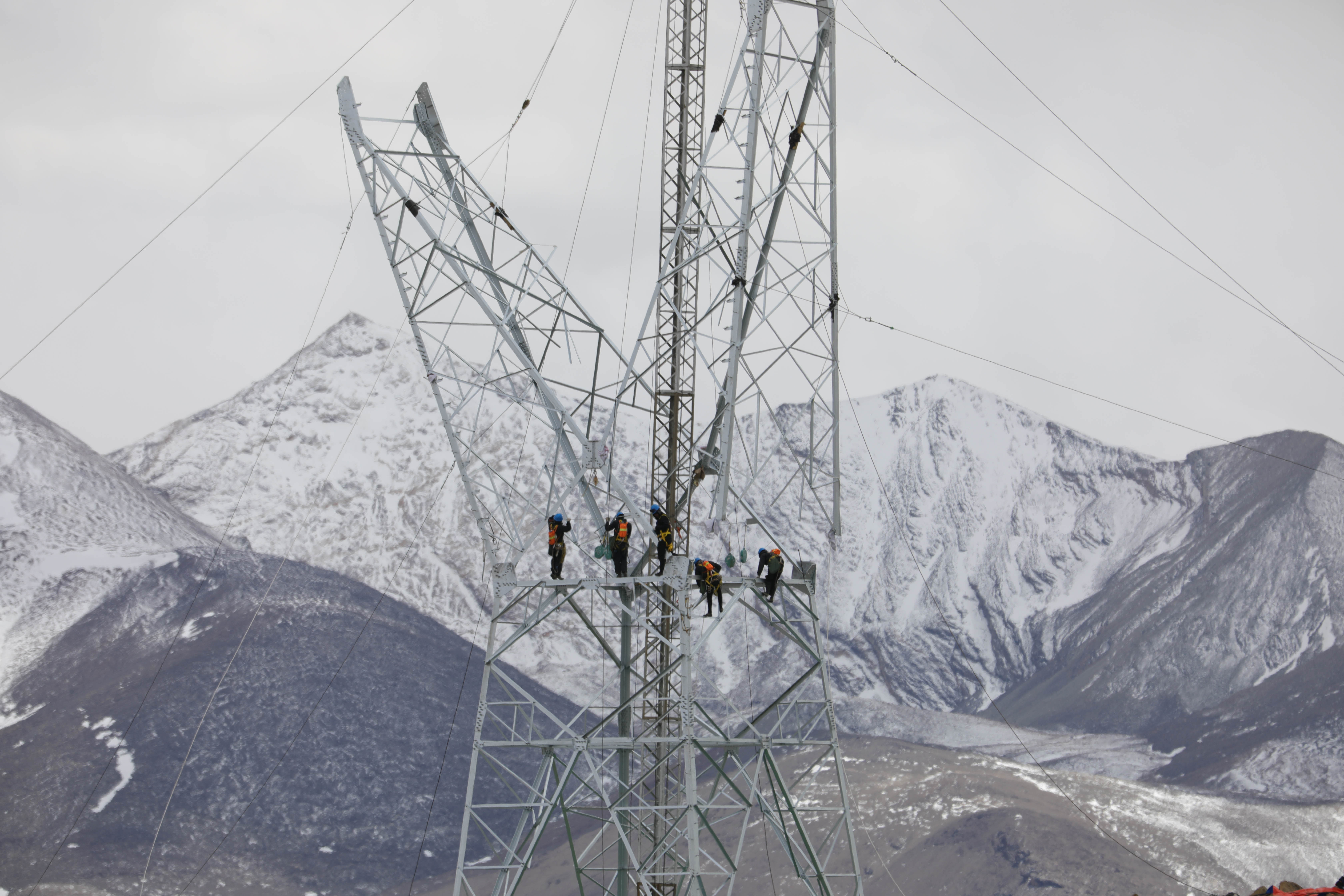 在日喀则市拉孜县与定日县交界处的嘉措拉山顶,海拔5357米,施工人员正在进行阿里与藏中电网联网全线海拔最高的500千伏输电铁塔组立施工。