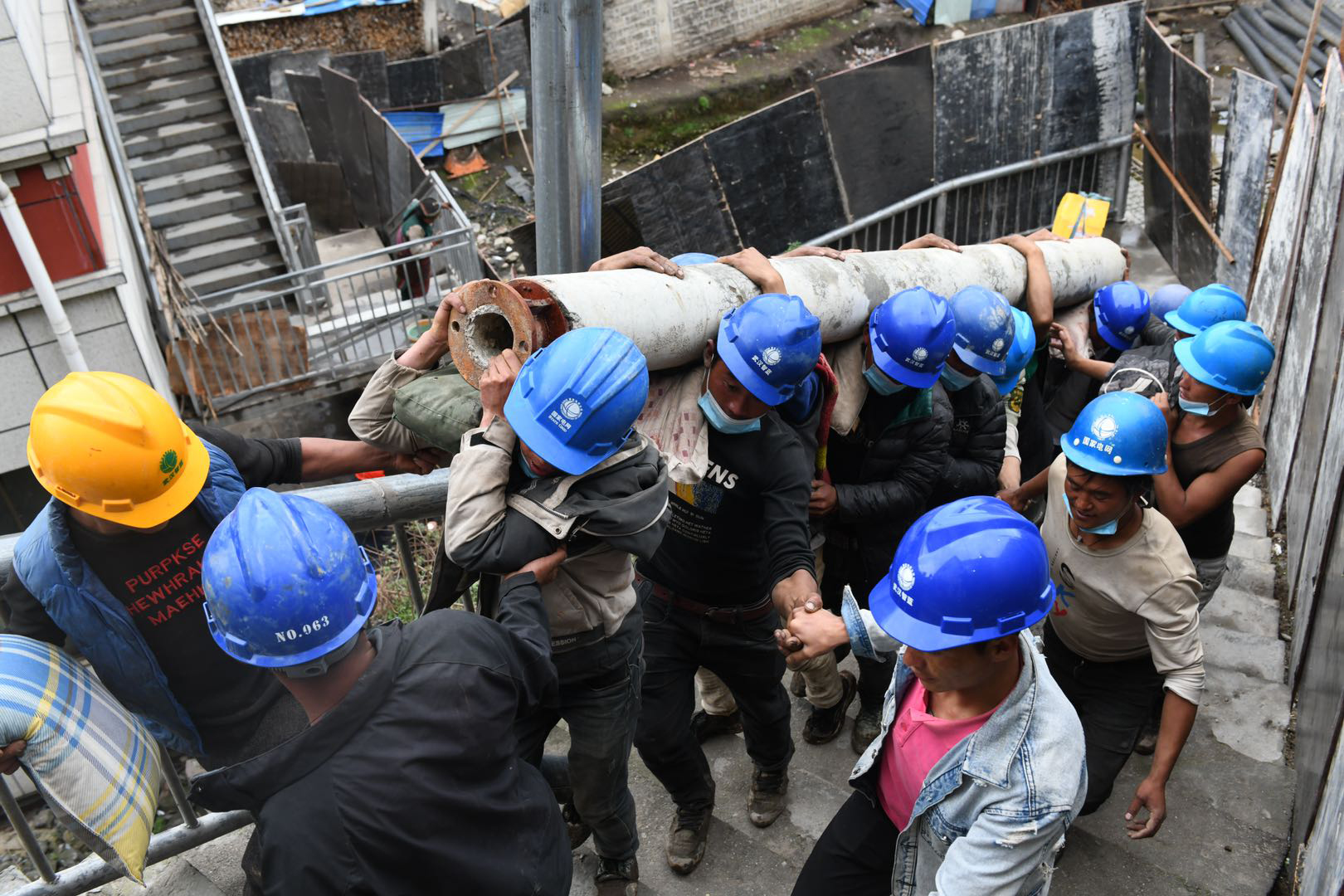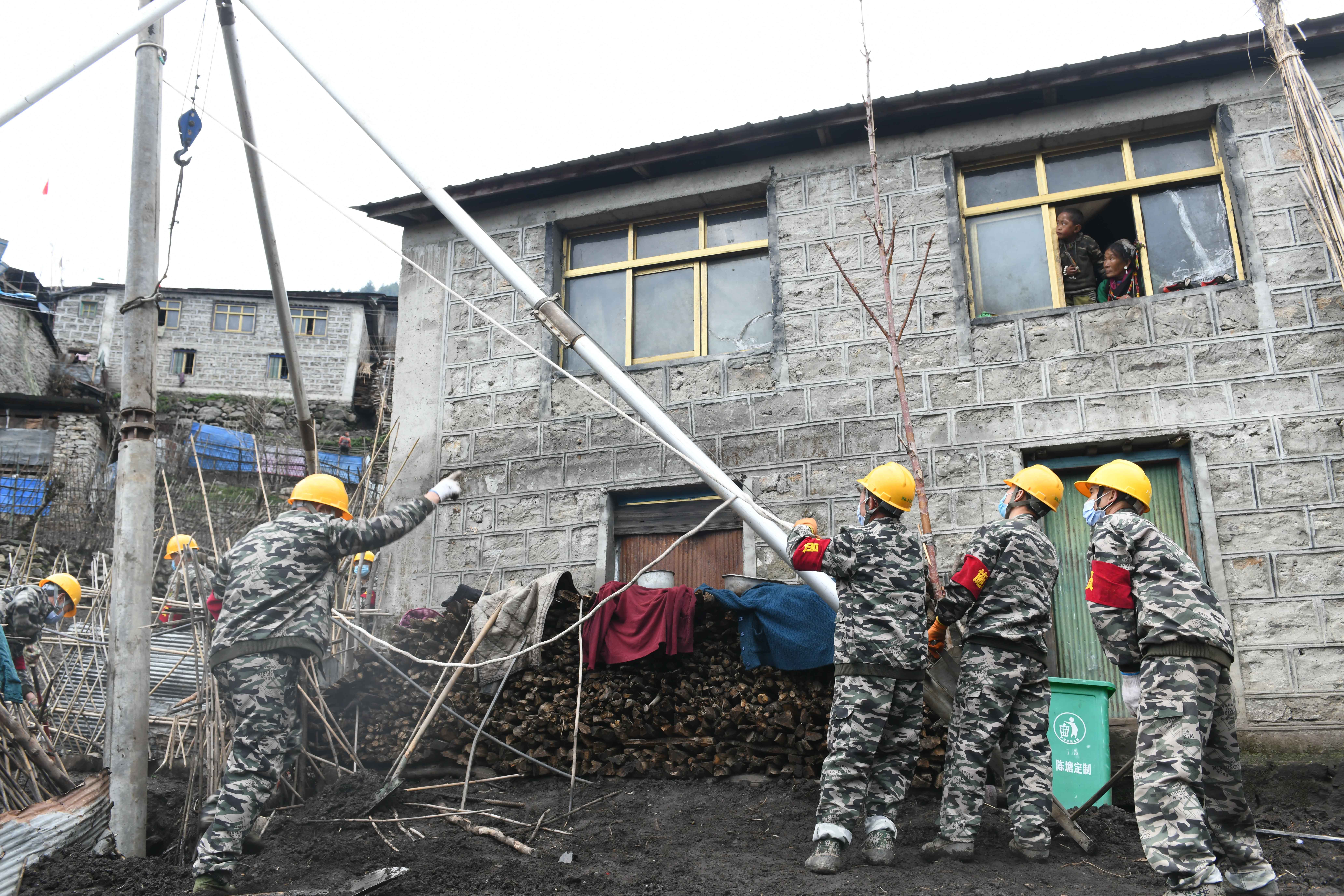 在西藏日喀则市定结县陈塘镇,电力施工人员正在“三区三州”深度贫困地区电网建设项目现场开展35千伏输电铁塔组立。