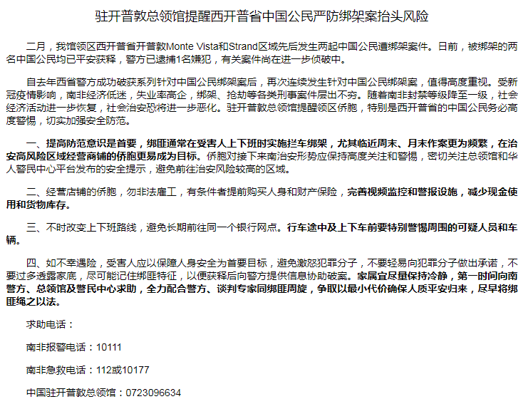 自去年西省警方成功破获系列针对中国公民绑架案后,再次连续发生针对中国公民绑架案,值得高度重视。受新冠疫情影响,南非经济低迷,失业率高企,绑架、抢劫等各类刑事案件层出不穷。随着南非封禁等级降至一级,社会经济活动进一步恢复,社会治安恐将进一步恶化。驻开普敦总领馆提醒领区侨胞,特别是西开普省的中国公民务必高度警惕,切实加强安全防范。