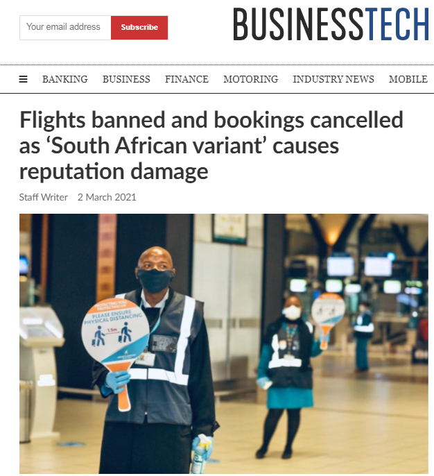 南非旅游商业理事会(TBCSA)近日表示,南非科学家最早发现了新冠变异病毒501Y.V2,然而一些人却将其称为南非变异病毒。这导致很多人对南非产生恐慌,一些大型活动面临被取消的风险,大量2021年下半年飞往南非的机票和当地住宿预订已纷纷被取消。美国1月底禁止入境前14天曾在南非停留的人入境,英国则于2月起将南非列入33个入境前必须接受酒店强制隔离、检疫国家的名单。这两国还建议本国公民不要前往南非。