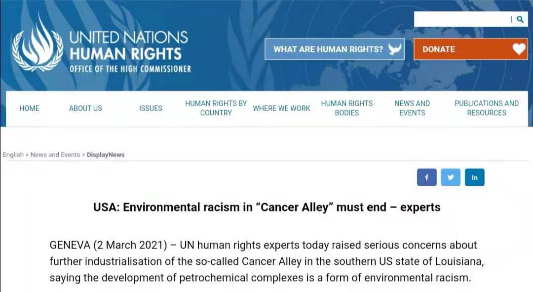 “这种环境式的种族主义对非裔美国人的人权产生严重影响”,联合国人权专家表示。“曾经在这片土地劳作的非裔美国人如今成为石化企业环境污染的最大受害者,他们的人权正受到侵犯,而联邦的法规未能保护该地区的民众。”人权专家指出。