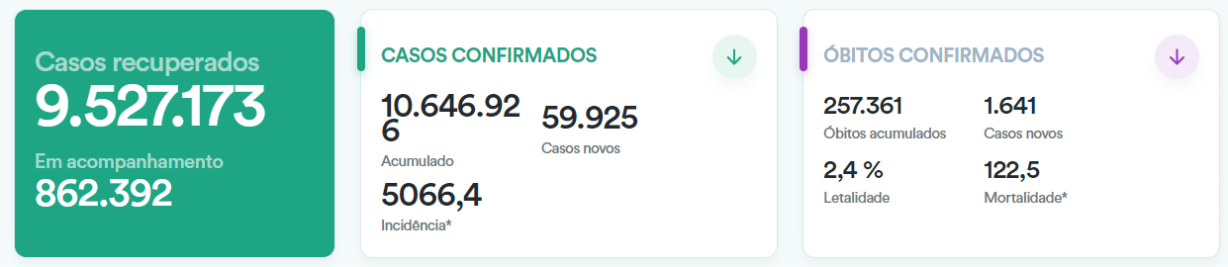 截至当地时间3月2日21时,根据巴西卫生部发布的数据,巴西新冠肺炎累计确诊病例达10646926例,较前一日新增59925例;累计死亡病例257361例,较前一日新增1641例;累计治愈人数9527173人。