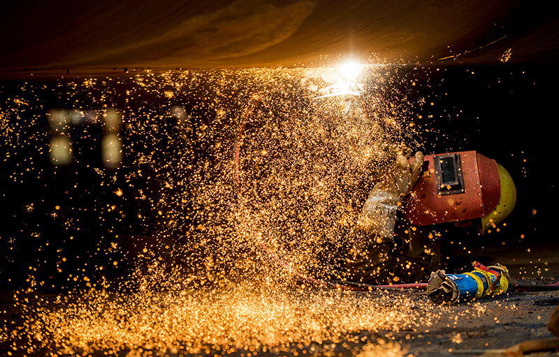 2月24日,江西省九江市都昌县造船总厂船舶制造工地,工人在进行焊接作业 傅建斌摄/本刊