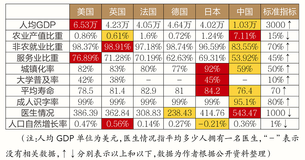 从表格中的数据可以看出,中国的各项指标均在现代化标准指标范围内。不过,中国在现代化的一些领域也存在一些差距。