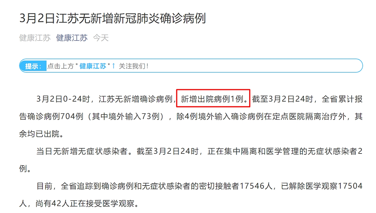 3月2日0—24时,江苏无新增确诊病例,新增出院病例1例。截至3月2日24时,全省累计报告确诊病例704例(其中境外输入73例),除4例境外输入确诊病例在定点医院隔离治疗外,其余均已出院。