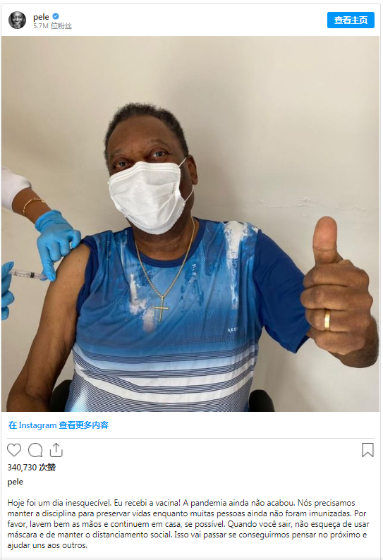 贝利在其发布的动态中表示:“今天是令人难忘的一天,我接种了疫苗!疫情还没有结束,我们需要遵守规定,保护其他人的生命,因为很多人仍然没有接种疫苗。请大家好好洗手,并尽可能留在家中。如果必须外出,请不要忘记戴好口罩,并保持社交距离。如果我们能为他人着想,并帮助其他人,疫情终将成为过去。”(总台记者 杨兢兢)