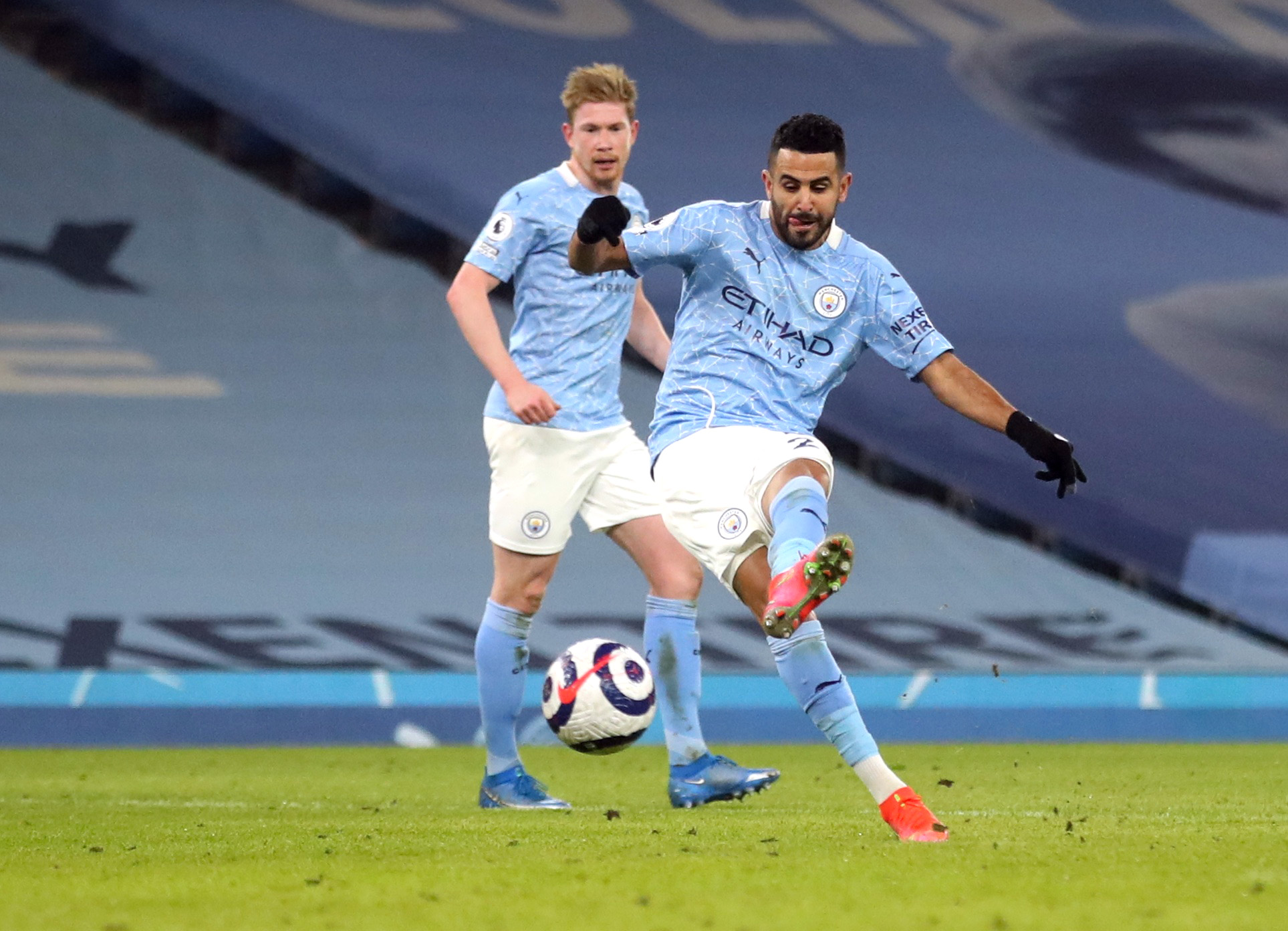 3月2日,曼城队球员马赫雷斯(右)在比赛中射门得分。新华社/路透