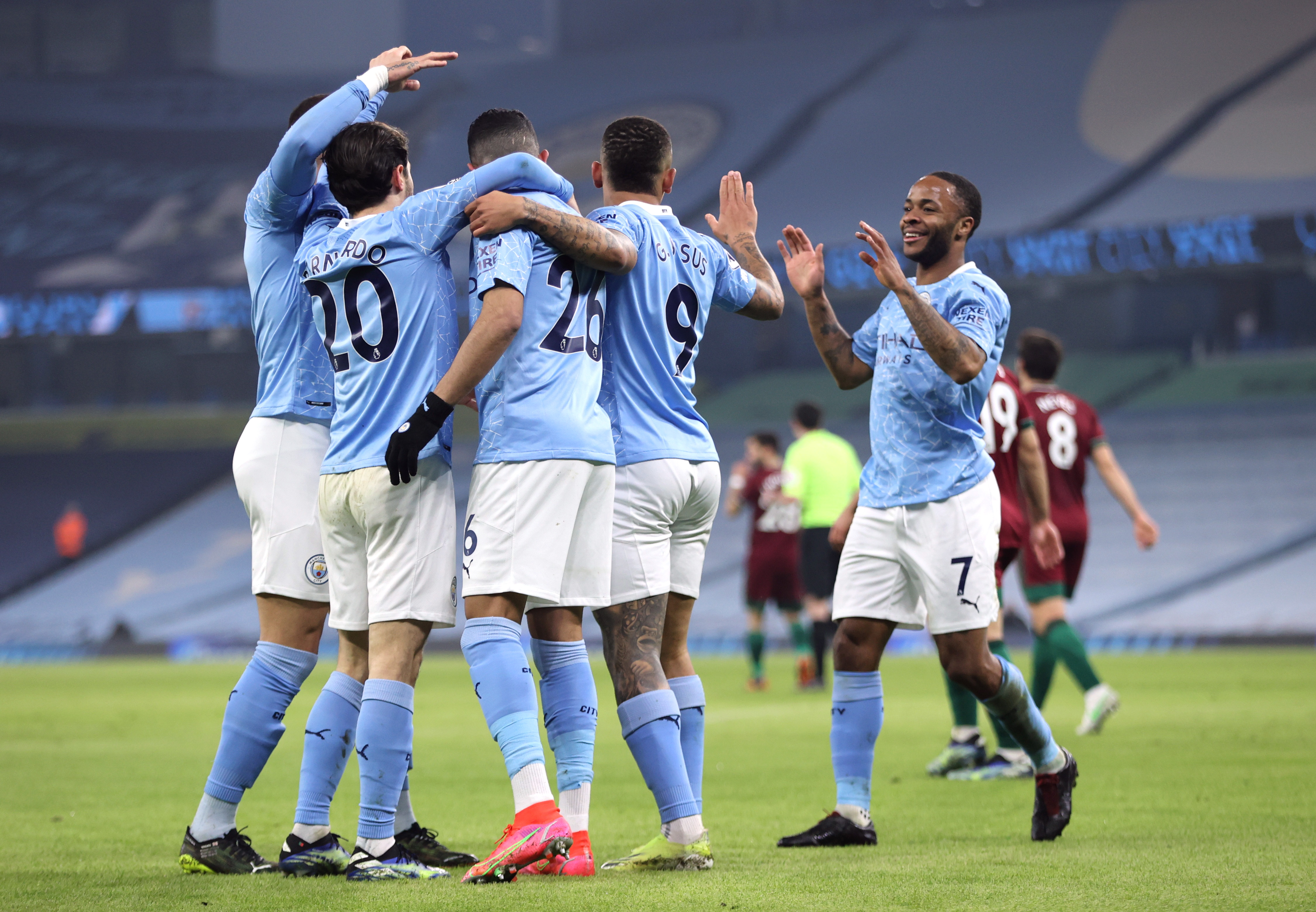 3月2日,曼城队球员庆祝狼队球员登东克尔射中乌龙球。新华社/路透