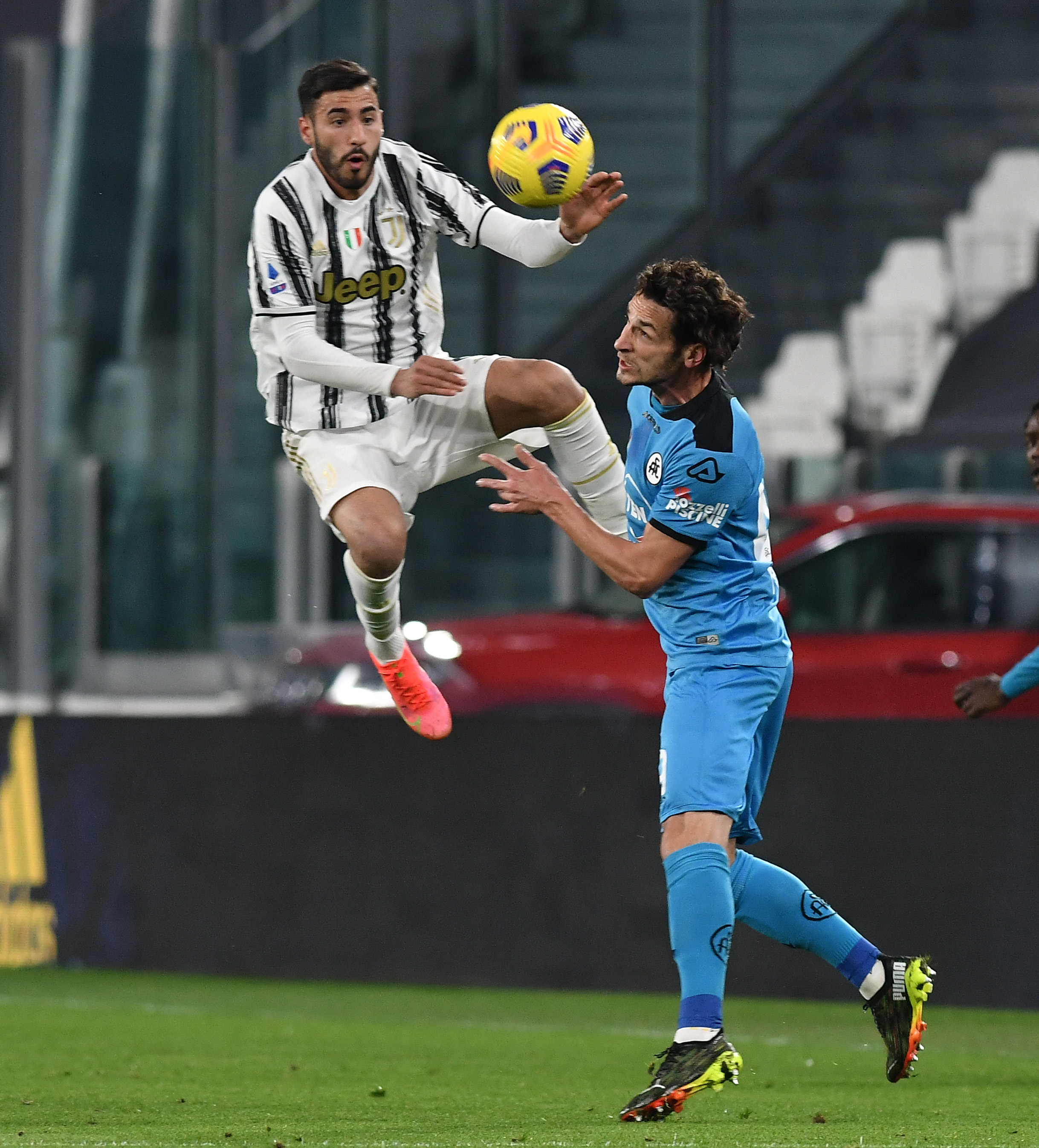 3月2日,尤文图斯队球员弗拉博塔(左)和斯佩齐亚队球员维尼亚利拼抢。新华社发(费代里科·塔尔迪托摄)