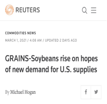△路透社刊文指出,美国大豆的需求增长为美国出口带来希望