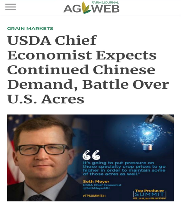 △美国农业部首席经济学家塞斯·迈耶称,中国购买力将影响美国农作物种植的面积和价格