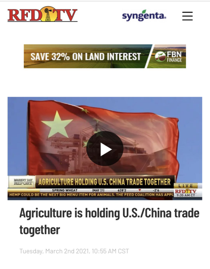 △美国农业新闻频道RFD-TV网站刊文指出,农业将中美贸易紧密结合