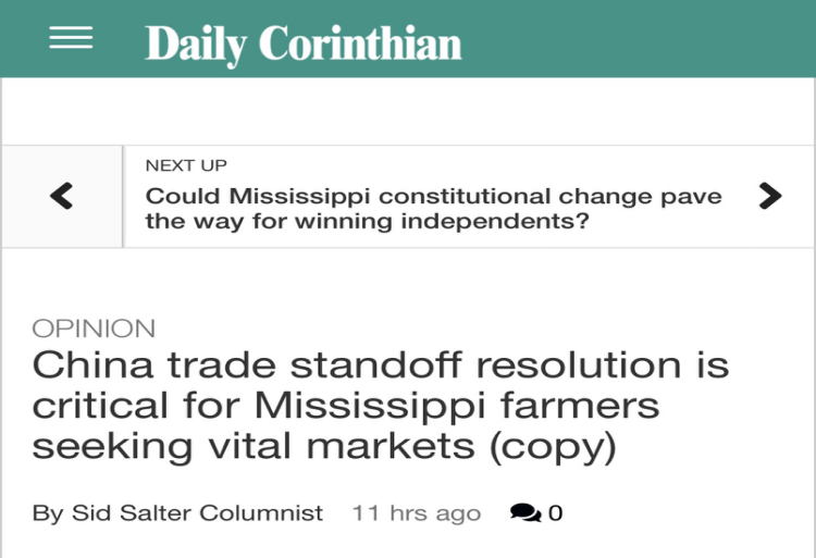 △《科林斯每日报》称,解决中美贸易僵局是解决密西西比州农业市场问题的关键