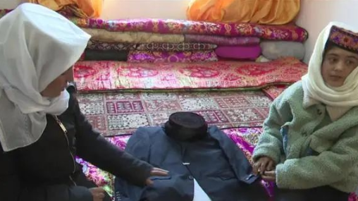 阿米娜(左)和女儿抚摸着拉齐尼的衣服。 如歌 摄