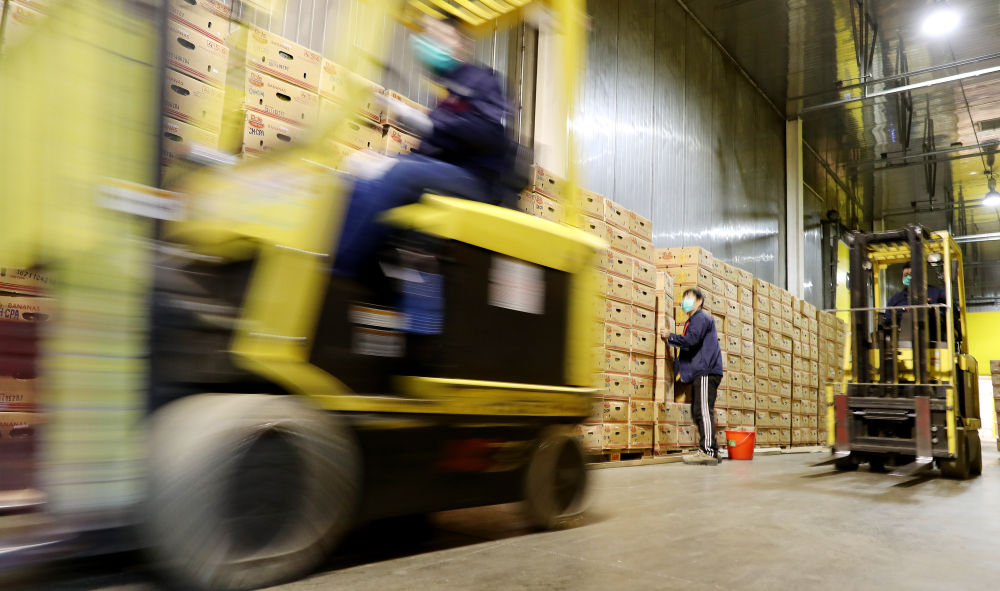 图为位于上海浦东新区的一家企业,工作人员驾驶叉车行驶在厂区仓储区内。