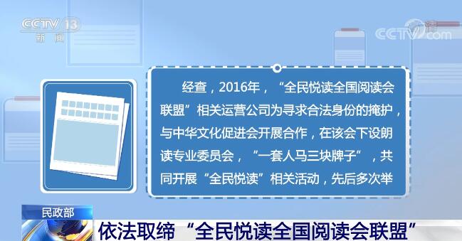 经查,2016年,“全民悦读全国阅读会联盟”相关运营公司为寻求合法身份的掩护,与中华文化促进会开展合作,在该会下设朗读专业委员会,“一套人马三块牌子”,共同开展“全民悦读”相关活动,先后多次举办“全民悦读朗读大会暨青少年朗读课文大会”,违规开展评比表彰活动并收取费用。民政部依据《社会团体登记管理条例》第三十二条的规定,对“全民悦读全国阅读会联盟”予以取缔。