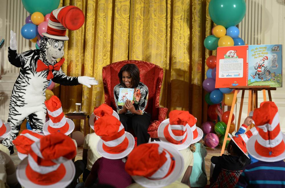 图为2015年1月21日,时任美国第一夫人米歇尔·奥巴马(后中)在华盛顿白宫举行的读书活动上为孩子们朗读苏斯博士的新版图书。(新华社/法新)