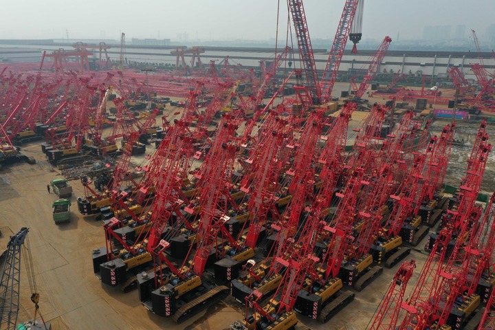2020年7月29日,在位于湖州市吴兴高新区的浙江三一装备有限公司拍摄的等待交付的履带起重机(无人机照片)。新华社记者黄宗治摄