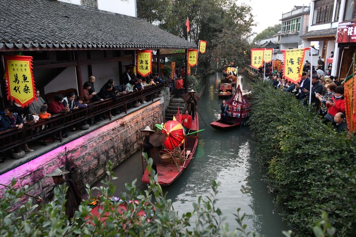 游客在湖州市南浔区和孚镇荻港村观看“水上晒秋”丰收庆典。(2020年11月15日摄)新华社记者记者黄宗治摄
