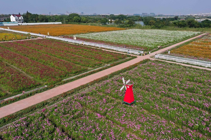 游客在湖州市吴兴区八里店镇移沿山生态景区的花海游览(2020年10月2日无人机摄)。新华社记者黄宗治摄