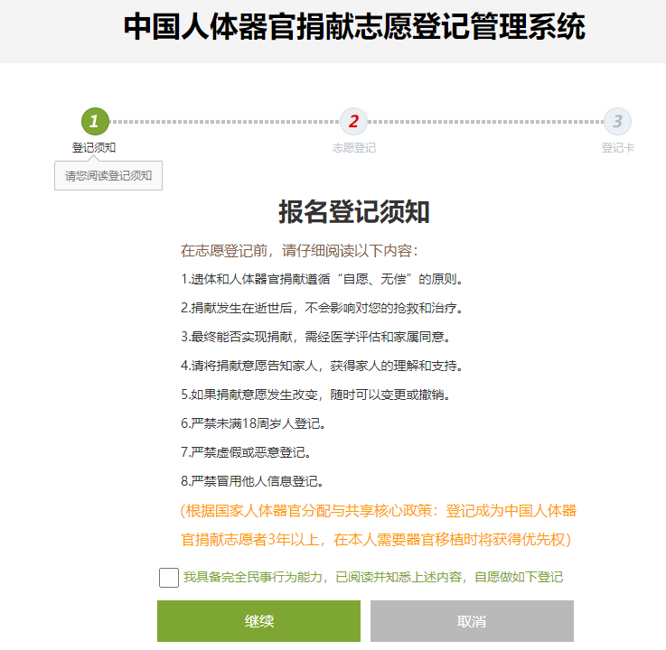 在完成网络登记后,每位器官捐献志愿者会即刻收到一张写有编号、姓名和时间的电子版“中国人体器官捐献志愿登记卡”,下方还会温馨提示写道:登记成为志愿者3年以上,在本人需要器官移植时将获得优先权。