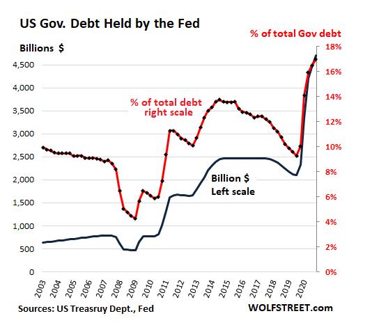 △美联储持有美国国债额度(蓝线)及其占总额的比例(图片来源:WOLFSTEET)