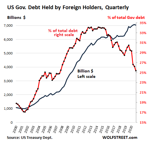 △2000年—2020年外国持有美国国债规模及占总额比例走势图(图片来源:WOLFSTEET)