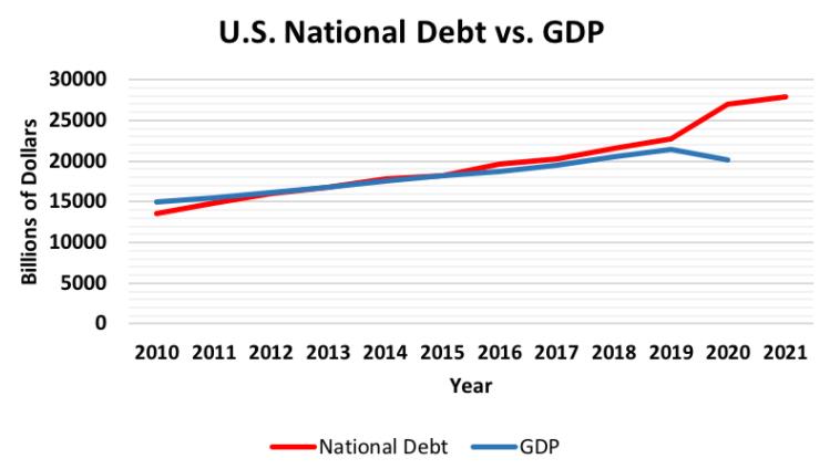 △2010年—2021年美国国债规模和GDP曲线图(数据来源:美国财政部)