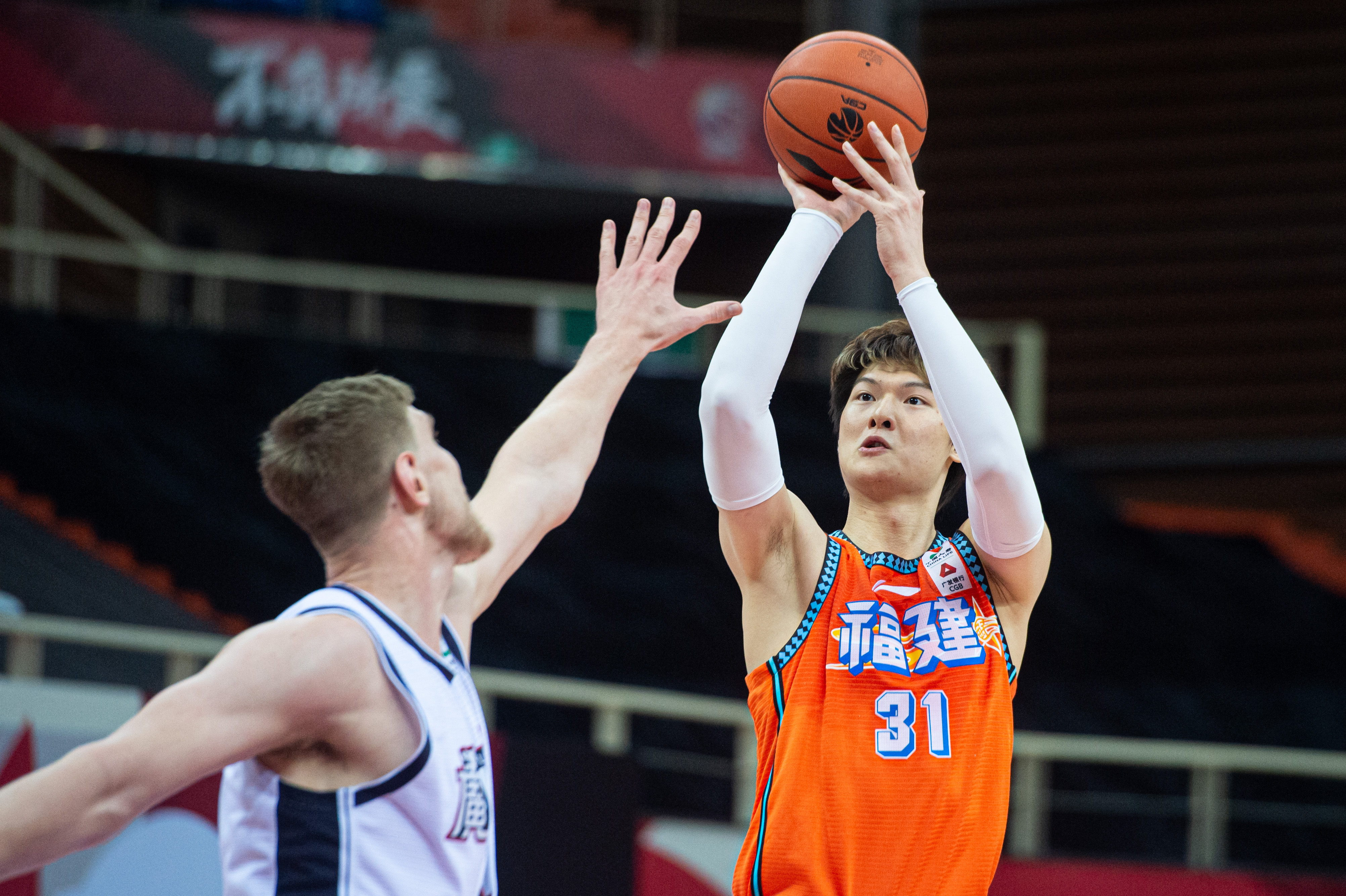 福建队球员王哲林(右)投篮。新华社记者江汉摄