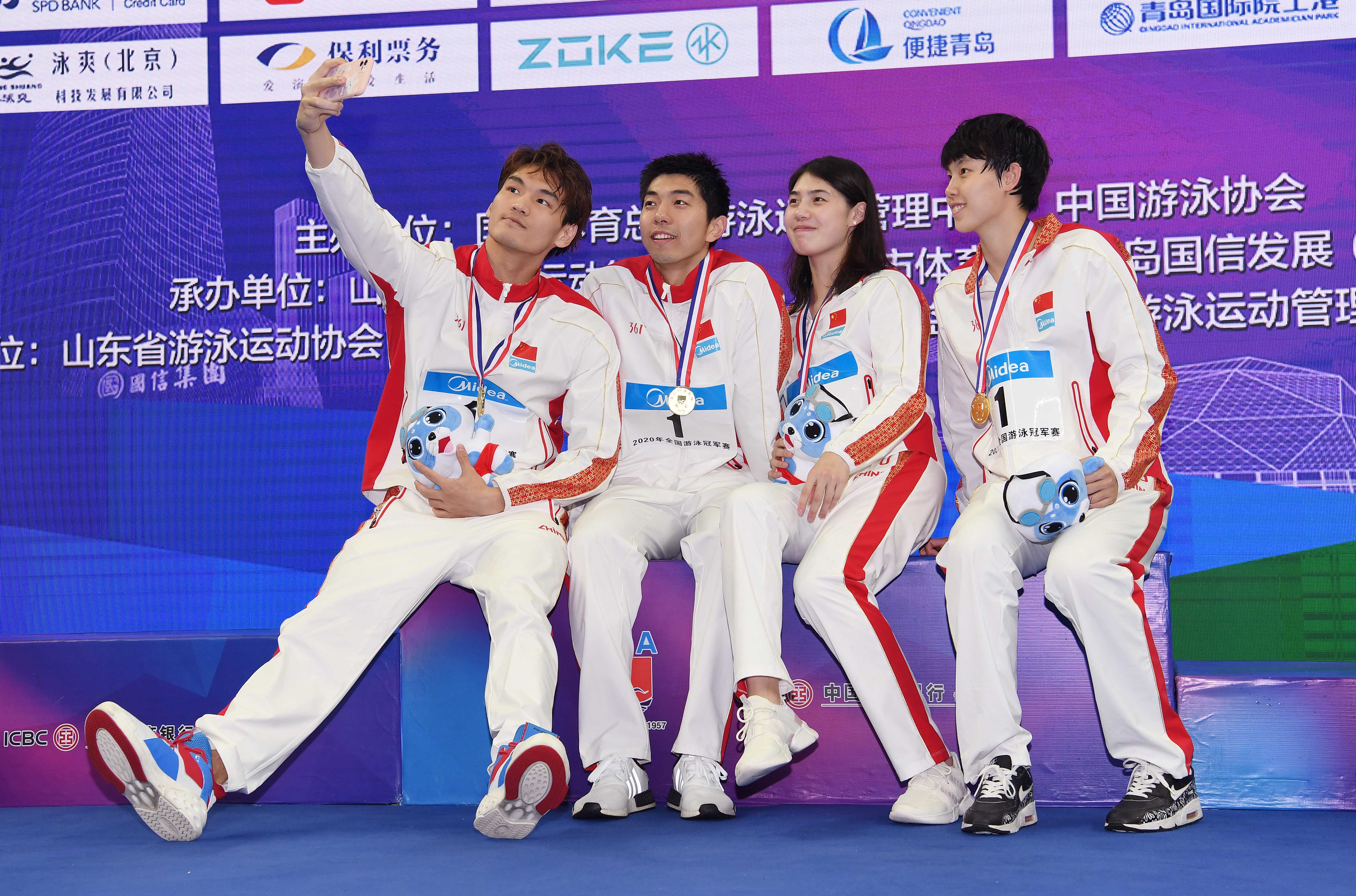 2020年10月,在2020年全国游泳冠军赛暨东京奥运会达标赛男女4X100米混合泳接力预赛中,徐嘉余、闫子贝、张雨霏和杨浚瑄以3分38秒41打破世界纪录。新华社记者陶希夷摄