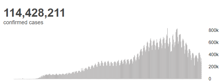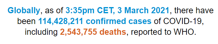 根据世卫组织最新实时统计数据,截至欧洲中部时间3月3日15时35分(北京时间3月3日22时35分),全球累计新冠肺炎确诊病例114428211例,累计死亡病例2543755例。3日全球新冠肺炎确诊病例新增348281例,死亡病例新增7807例。(总台记者 朱赫)