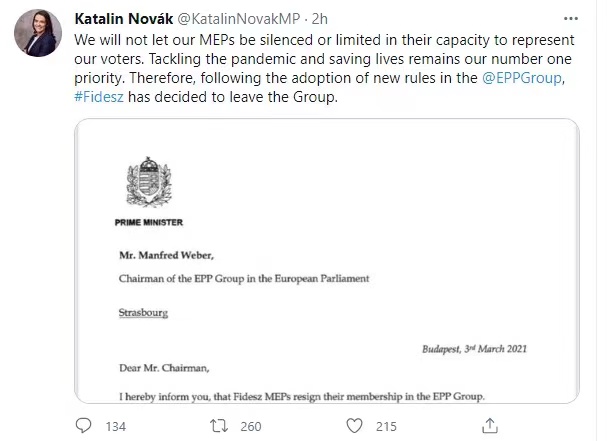 当地时间3月3日,匈牙利执政党青年民主主义者联盟(青民盟)副主席卡塔琳·诺瓦克对匈牙利媒体表示,目前谈青民盟退出欧洲人民党还为时过早,青民盟将暂在欧洲议会独立行动。