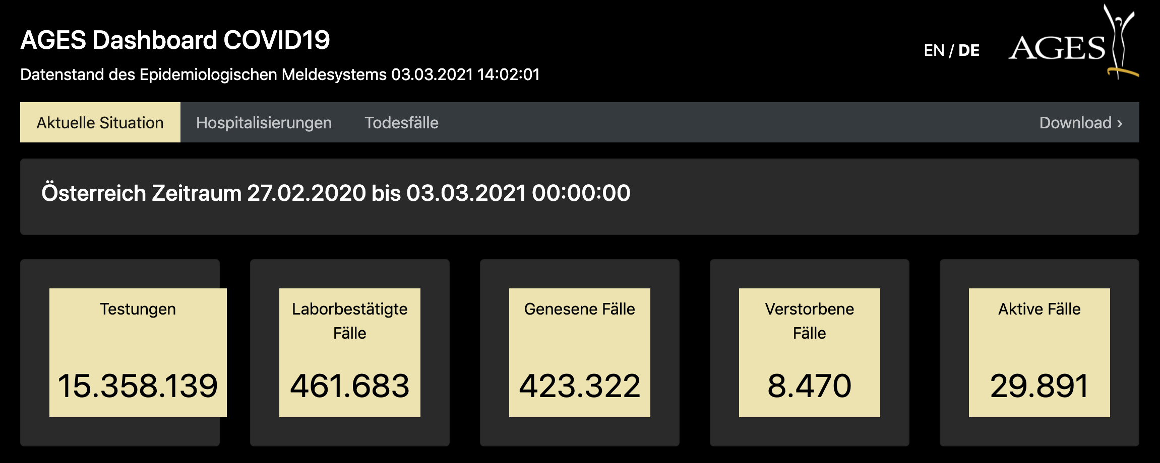 奥地利卫生部最新数据显示,截至当地时间3月3日14时02分(即北京时间3月3日21时02分),该国新增新冠肺炎确诊病例2497例,累计确诊461683例;新增死亡14例,累计死亡8470例;累计治愈423322例。截至目前,共有1425名新冠肺炎患者在医院接受治疗,其中有301名患者在重症监护室。