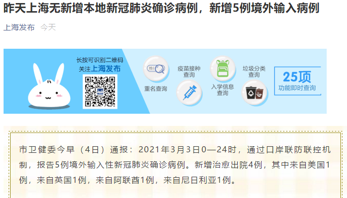 据“上海发布”微信公众号发布的消息,上海市卫健委今早(4日)通报:2021年3月3日0—24时,通过口岸联防联控机制,报告5例境外输入新冠肺炎确诊病例。新增治愈出院4例,其中来自美国1例,来自英国1例,来自阿联酋1例,来自尼日利亚1例。