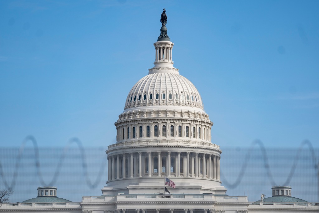 2月9日在美国华盛顿透过隔离围栏拍摄的国会大厦。(新华社记者刘杰摄)
