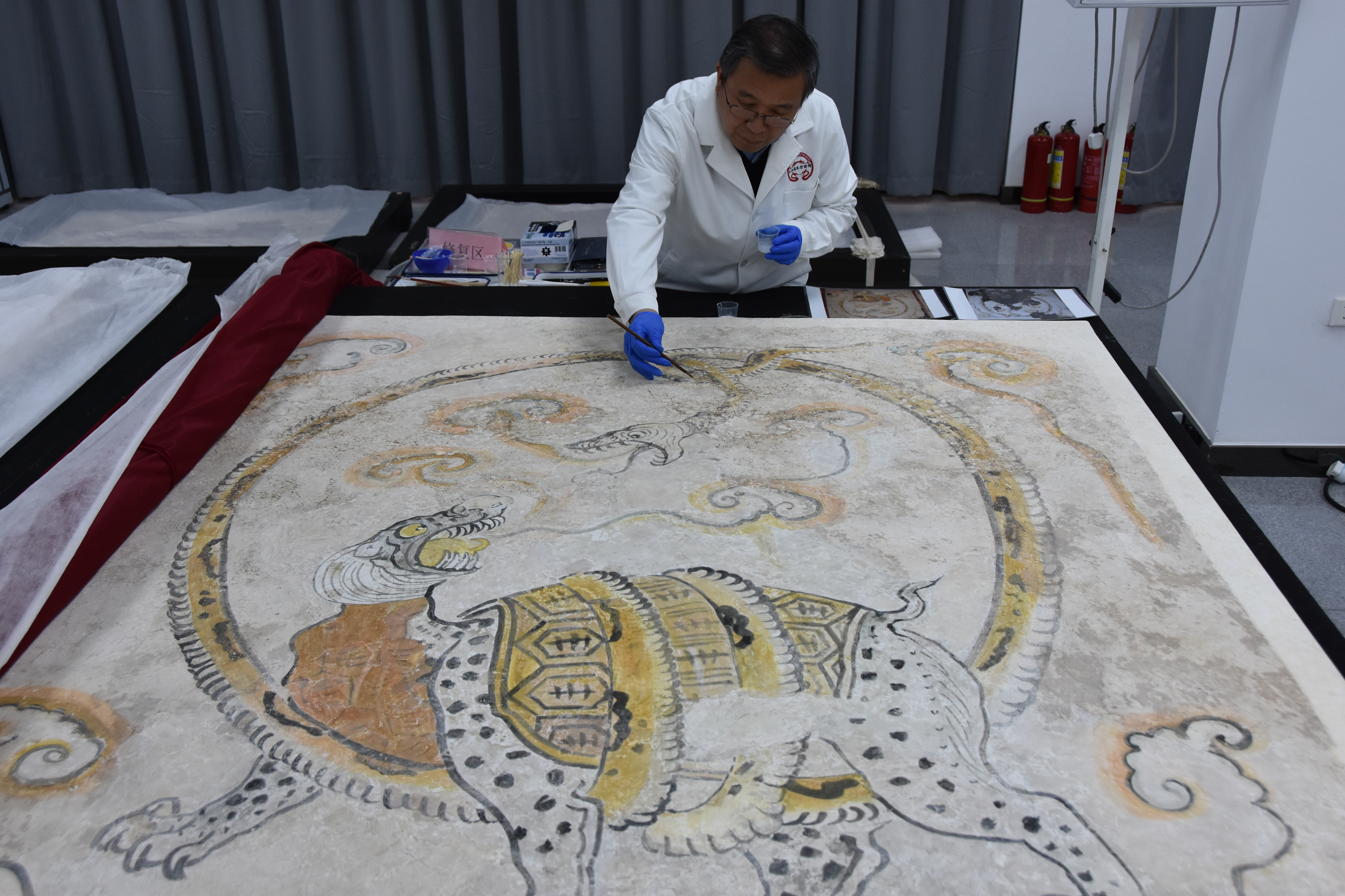 文物修复工作者对唐韩休墓壁画进行修复。新华社记者杨一苗摄