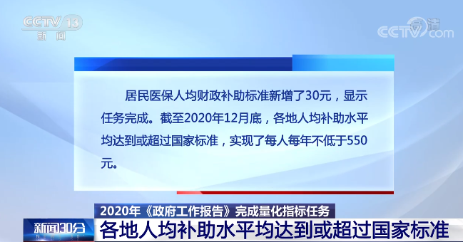 在社会保障领域,居民医保人均财政补助标准新增了30元,显示任务完成。截至2020年12月底,各地人均补助水平均达到或超过国家标准,实现了每人每年不低于550元。而随着今年3月1日最新版的医保目录正式落地,可以医保报销的药品数量达到历史最多水平。