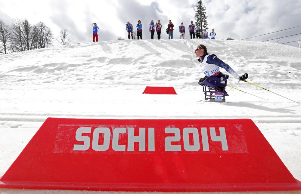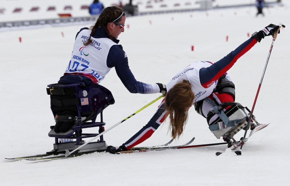 ↑2014年3月9日,美国选手麦克法登(左)在女子12公里-坐姿比赛冲刺时帮助挪威选手斯卡斯泰因。