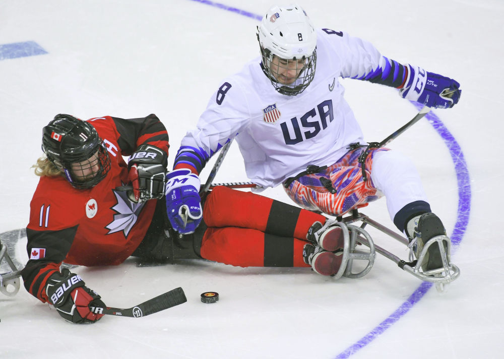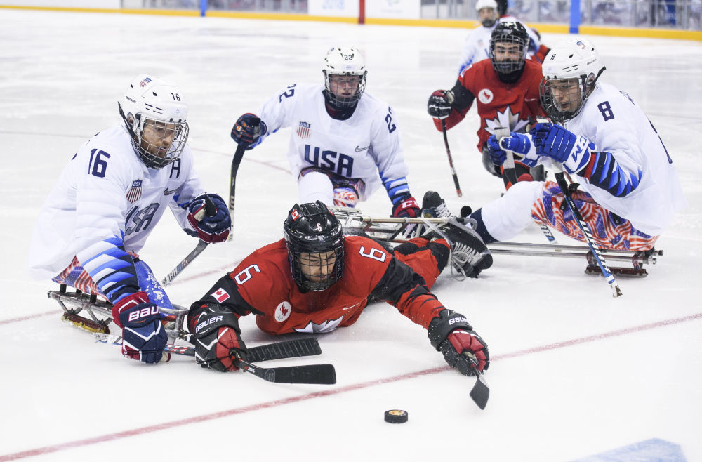 冬残奥会的残奥冰球混合团体项目相当于奥运会中的冰球项目。比赛时,双方上场队员各6人,比赛分三局进行,每局15分钟,中间休息15分钟,进一球得1分,得分多者为胜。运动员们用冰橇代替冰鞋,球杆较尖的一端用来推行冰橇,用像船桨的一端击打冰球。