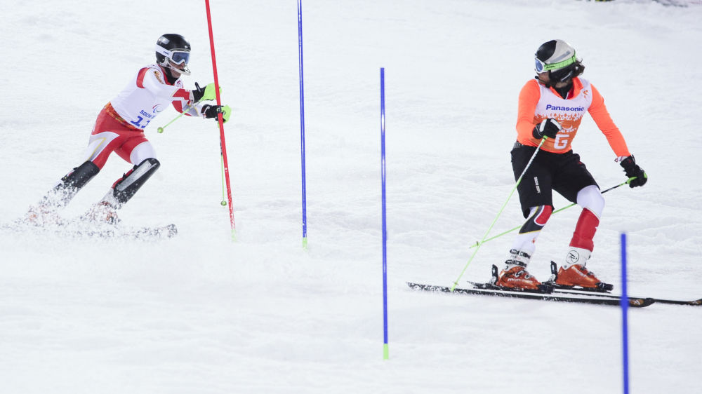 ↑女子回转-视障,运动员(左)与引导员一起滑下赛道。