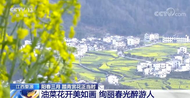 进入三月,江西婺源12万亩油菜花盛开,绚丽的春光吸引了各地游客慕名前来踏青赏花。在江岭景区,从高处眺目远望,入眼处满目金黄,粉墙黛瓦的徽派古民居点缀其中,加上远处的群山,构成了一幅色彩斑斓的春光图,吸引了不少游客驻足拍照。