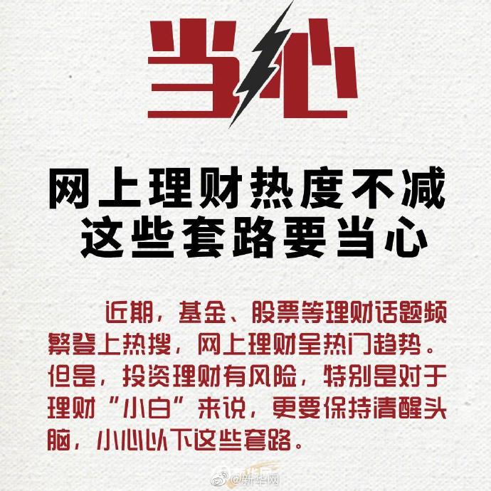 近期,基金、股票等理财话题频繁登上热搜,网上理财呈热门趋势。但是,投资理财有风险,特别是对于理财“小白”来说,更要保持清醒头脑,小心以下这些套路。