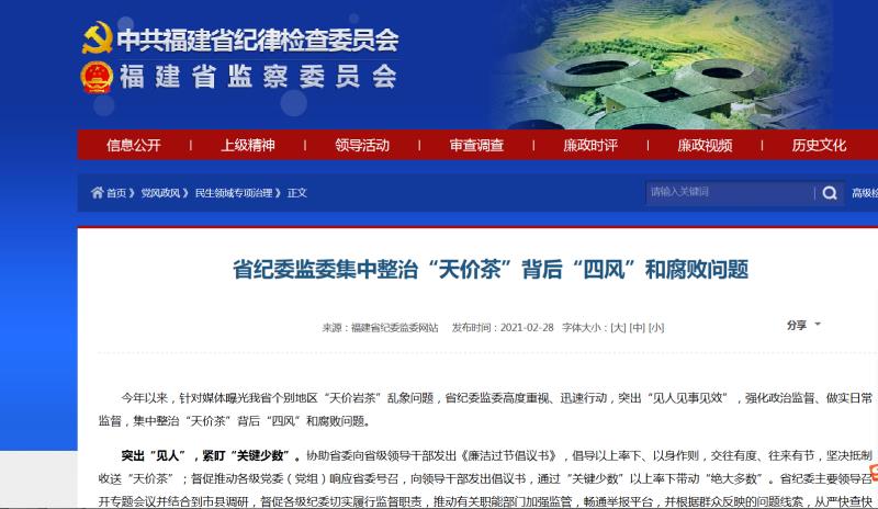 对于“天价茶”背后的“四风”问题和腐败风险,福建省纪委监委迅速行动,强化政治监督、做实日常监督,开展集中整治。一方面,在全省范围内,向领导干部发出倡议书,坚决抵制收送“天价茶”。另一方面,畅通信访举报渠道,通过网站、新闻媒体、通信运营商等发布涉及“天价茶”等名贵特产、特殊资源问题信访举报方式的公告,充分发挥群众监督作用,从严快查快处党员干部公款购买、违规收送“天价茶”行为。